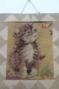 Kakak perempuanku membuat hiasan kucing dalam pigura itu bertahun-tahun silam, belasan tahun lalu dari saat ini. Ia membuatnya dengan cara kristik, dengan benang yang disilang ke kanan kiri dan menggunakan warna-warna yang menampilkan gradasi.