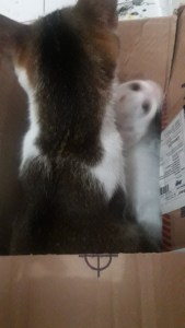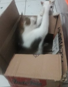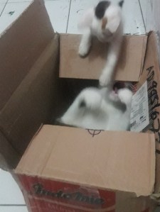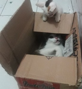 Pagi ini si Coki, ibu kucing yang depresi itu menghambur masuk. Aku sudah tak marah padanya. Setelah makan ia ikut-ikutan aksi bercilukba di kardus bersama Kidut. Sepertinya ia mulai bisa tersenyum dan tak lagi depresi. Semoga nanti ia bisa jadi ibu yang baik.