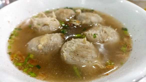 Bakso polos terhidang dengan kuah yang pekat. Baksonya menggunakan bahan daging pilihan. Rasanya gurih dan sedap juga lumayan mengenyangkan. Satu porsi isinya ada enam buah bakso.