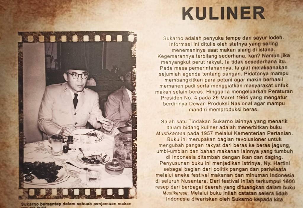 Nah di pojok kuliner pameran tersebut disebutkan bahwa Bung Karno menyukai tempe dan sayur lodeh. Baginya keragaman makanan yang ada di Indonesia itu adalah kekayaan yang patut diwariskan ke anak cucu. Oleh karenanya ia bersama istri begitu semangat untuk membukukan 1.600 resep yang diperoleh dari berbagai festival makanan dan minuman Indonesia ke dalam buku Mustikarasa.