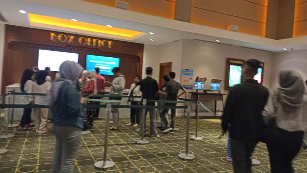 Tadi ketika masuk aku melihat antrian panjang membeli tiket di loket. Duh aku menyepelekan bioskop ini. Biasanya bioskop ini sepi banget pada hari-hari biasa. Kini ramenya luar biasa. Mungkin karena harga tiketnya juga lumayan murah. Libur lebaran masih Rp35 ribu. Termasuk murmer untuk ukuran Jabodetabek.