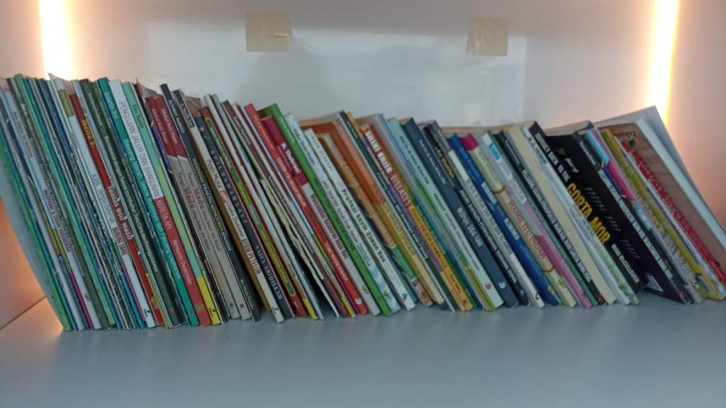 Aku melihat deretan bukunya. Kebanyakan bukunya serius, tentang teknologi hasil pertanian, tentang peternakan dan lainnya. Juga banyak buku bergambar untuk anak-anak.