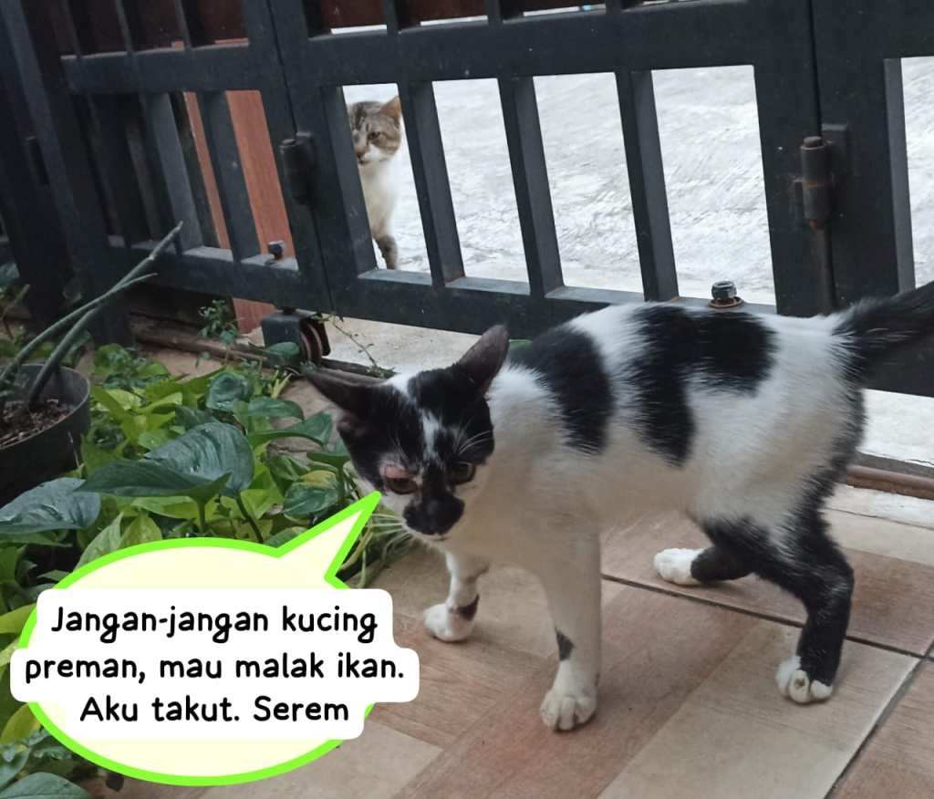 Asyik aku mau kabur ah. Aku mau main di jalan, guling-gulingan. Eh siapa kucing yang ngintip itu. Kok serem ya. Jangan-jangan kucing preman, mau malak ikan. Aku takut. Serem.