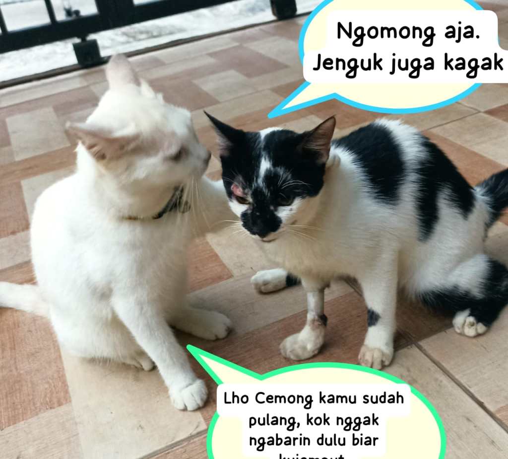 Lho Cemong kamu sudah pulang, kok nggak ngabarin dulu biar kujemput, kata Naura. Kamu cuma ngomong saja, jenguk saja nggak, tukas Cemong.