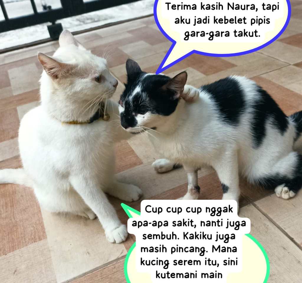 Cup cup cup nggak apa-apa sakit, nanti juga sembuh, kakiku juga masih pincang. Mana kucing serem itu, sini kutemani main, kata Naura gagah. Terima kasih Naura, tapi aku jadi kebelet pipis gara-gara takut.
