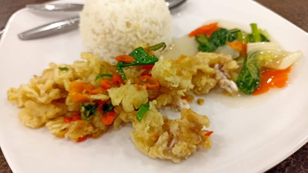 Cumi digoreng tepung lalu ditulis dengan bawang putih dan irisan cabe merah. Sebagai temannya ada tumis wortel, sawi hijau, dan sawi putih. Minumannya adalah es teh manis.