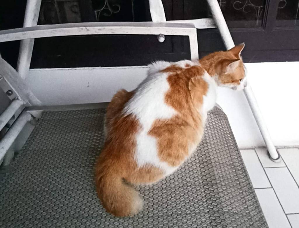 Kucing ini milik tetangga sebelah. Namun, suka numpang makan di teras rumah. Ia kucing betina. Kini ia berbadan dua.