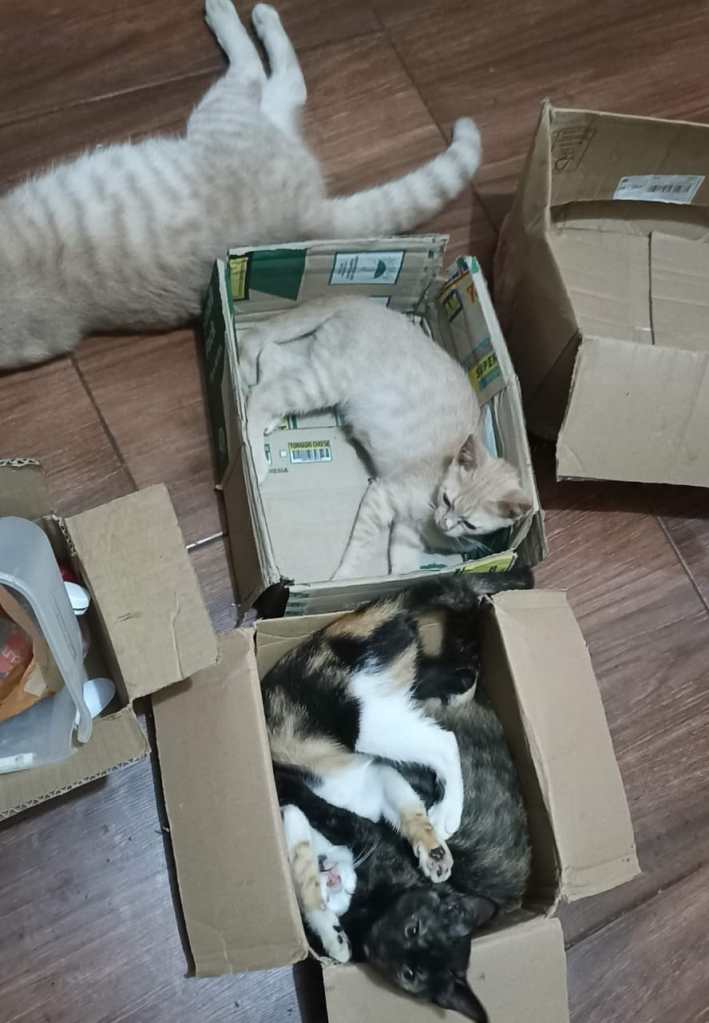 Sudah seminggu ini aku belum beberes sehingga kardus mulai menumpuk. Ketika aku mulai hendak melipat, kucing-kucing berdatangan. Mereka seperti melihat mainan. Asyik ada banyak benda untuk bermain.