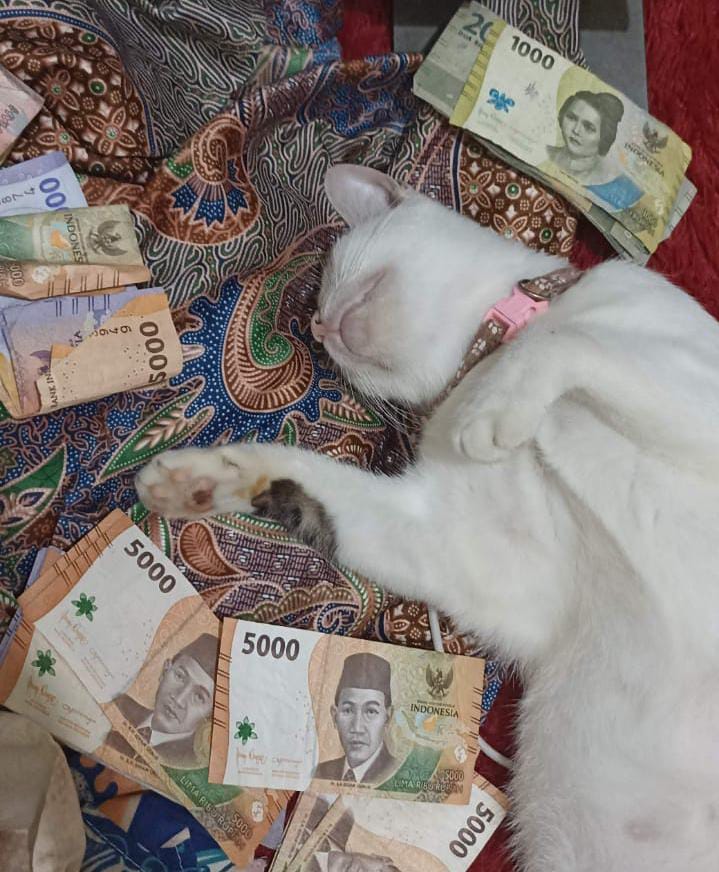 Kutaruh beberapa uang ribuanku di sekelilingnya yang asyik tidur di atas tumpukan bajuku. Duh padahal baru kucuci, bakal penuh bulu. Si Sam masih asyik tidur. Lalu kufoto, yang membuatnya seperti kucing yang angkuh. Kucing Sultan dengan banyak duit lima ribu, dua ribu, dan seribu.